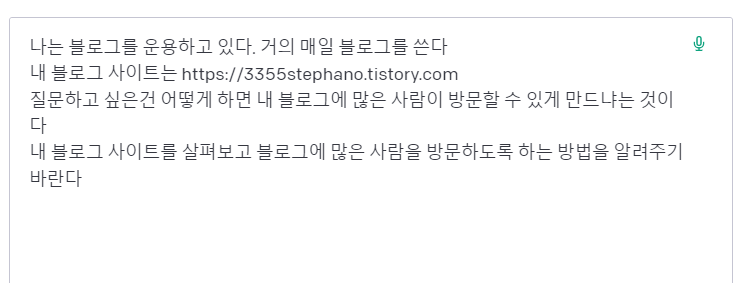 ” 블로그를 운영하고 있습니다. 거의 매일 블로그를 씁니다. 제 홈페이지는 https://3355stephano.tistory.com 입니다. 문제는 어떻게 하면 많은 사람들이 제 블로그를 방문하게 할 수 있느냐입니다. 트래픽을 늘리는 방법을 알려주세요.”