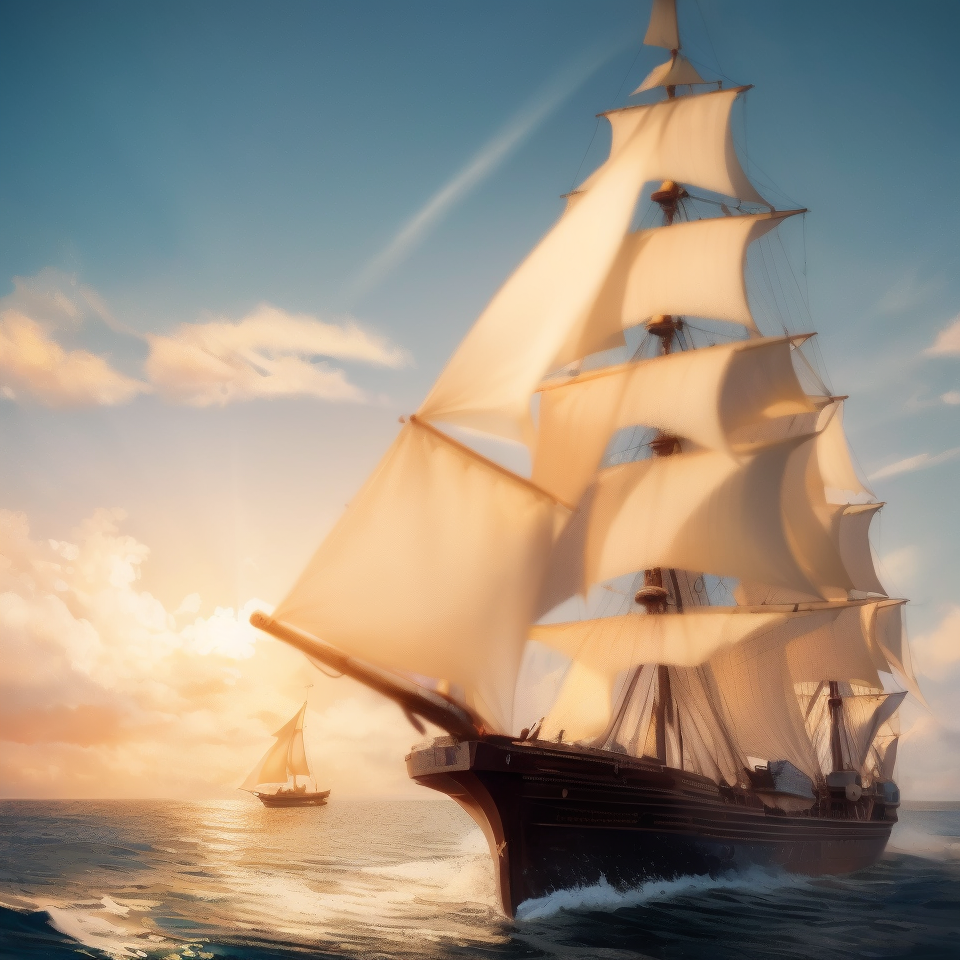 걸작, 다이나믹 앵글, 고화질, 초화질, 8k, 고해상도, 맑은 하늘, 맑은 날, 바다, 수평선, 발견의 시대, (큰 범선, 4개의 돛, 8개의 함포)